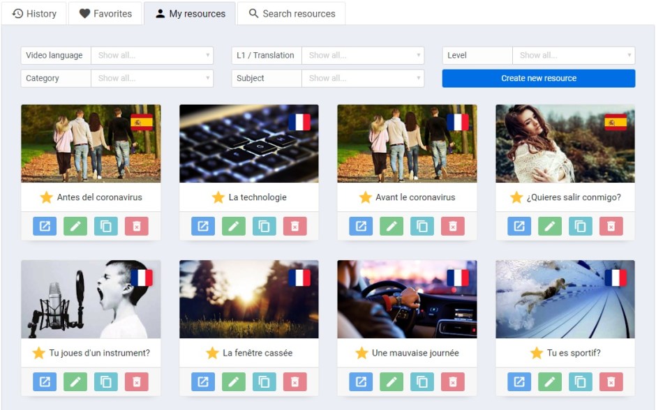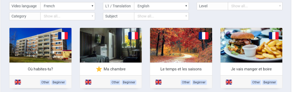 Browse and search through the many publicly available TeachVid resources via the resources page, using the selectors available to search by video language, translation, category, level, etc. (No advanced search though: this is available to subscribers only.)