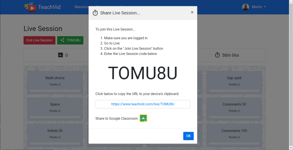 Share to Google Classroom from a TeachVid temporary LIVE Session