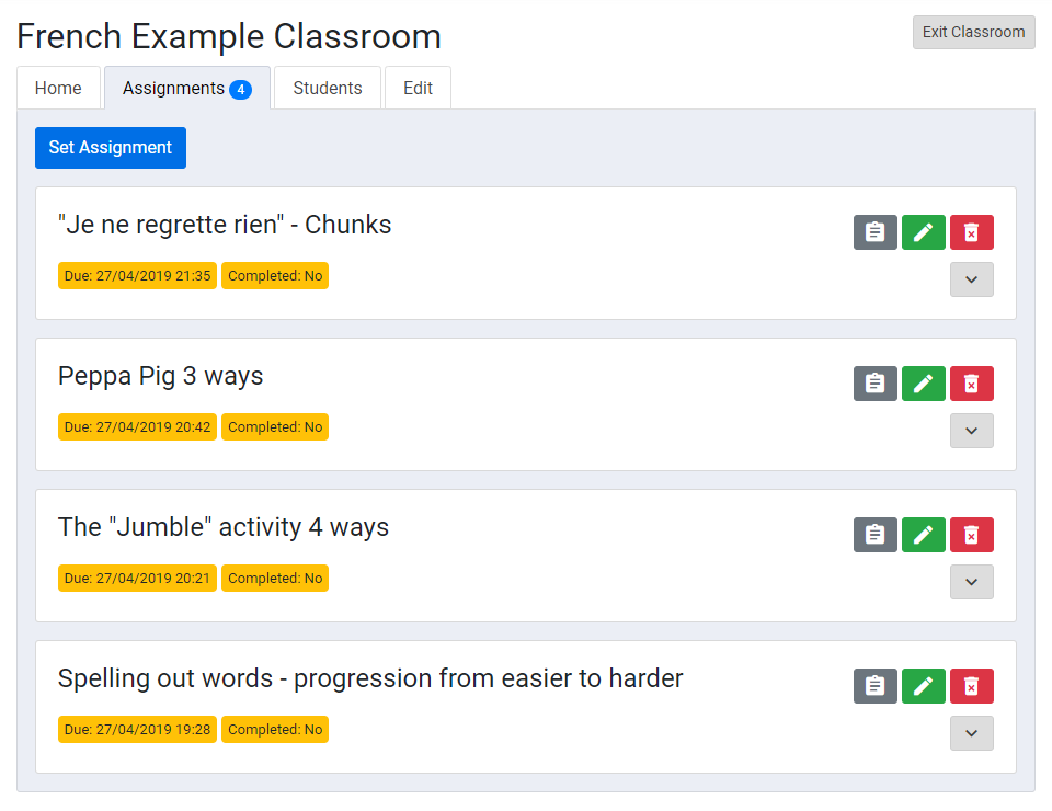 If you’d like to see how classrooms work in TeachVid, as well as trying out assignments which are intended to demonstrate the various assignment activity options available, please visit this Example Classroom, which has assignments similar to those shown in the images above and below. (You’ll need to register / log-in if you want to try the activities. You can register for free.)