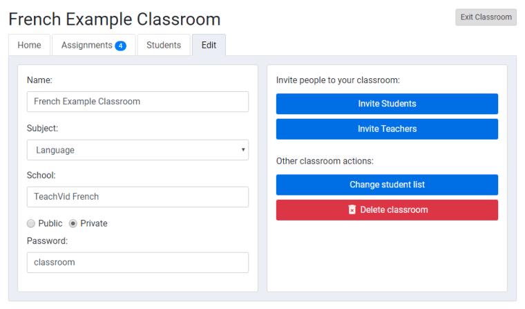 Once you have created your private classroom, open the “Edit” tab, and you should see something like the following: