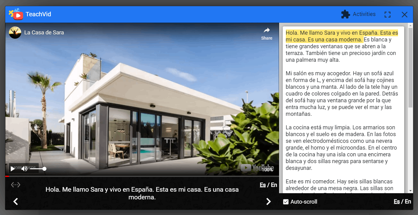 - Bilingual subtitles: these appear beneath the video. Note to the right of the subtitle (in the image above) there is an Es / En button, which currently has Es (Español) underlined. Students can click this to see the current subtitle in their L1 (in this case English).