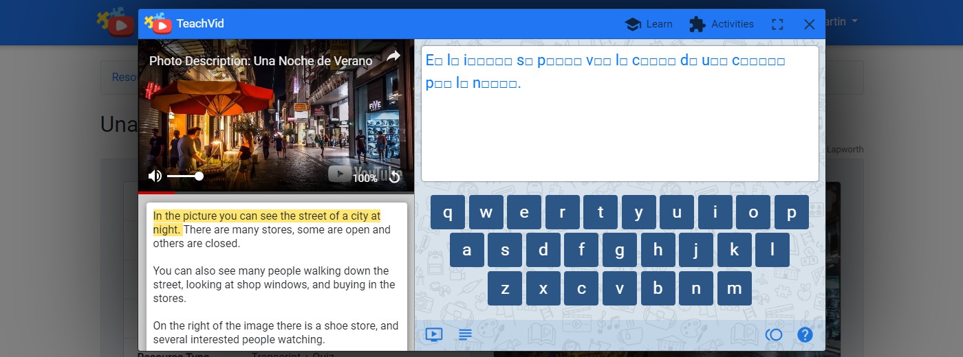 In TeachVid’s Activity Mode, each video resource is broken down into caption-based mini-tasks, where the specific section of the video plays, the specific section of the L1 translation is highlighted to reinforce meaning and provide structure, and the student must complete the relevant mini-task using a combination of listening, the L1 translation of the specific caption, and the context clues within the L2 caption itself as it appears as part of the task. The juxtaposition of the highlighted section of the L1 parallel text and the L2 caption (via audio and the mini-task) constantly draws the students’ attention to similarities and differences in structure. This is 100% about promoting noticing.