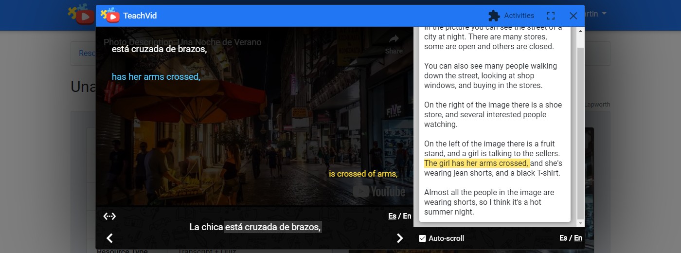 In TeachVid’s Learn Mode, students have access to bilingual subtitles and a full bilingual transcript, which shows the current video caption (or its L1 equivalent) as highlighted. So students can switch between the languages and make comparisons. They can turn on auto-pause so that the video pauses after each caption. They can click on specific ‘chunks’ in each caption to hear that chunk spoken via text-to-speech, and see chunk-specific translations and learning notes. This is all about promoting noticing.