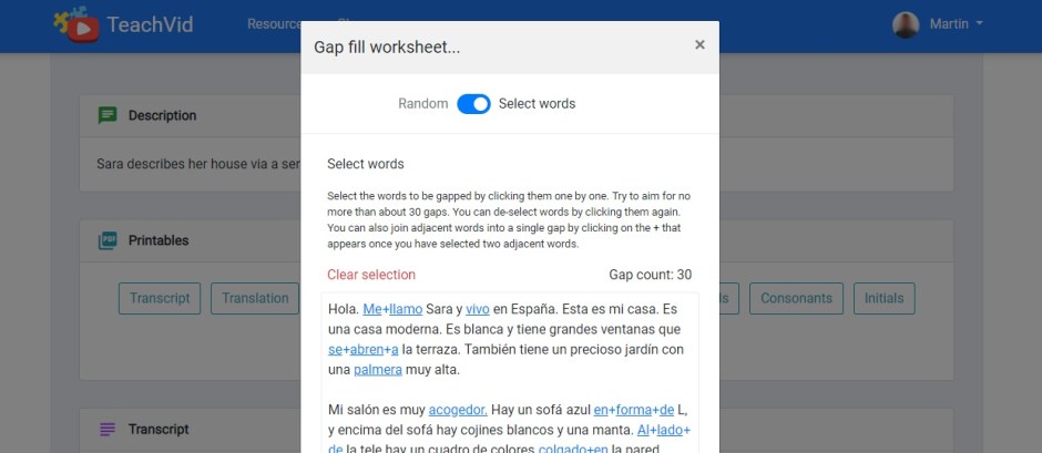 Previously, if you clicked on the “Gap fill” button, it automatically printed a random gap fill (with roughly 1 in 7 words gapped, up to a maximum of 30 gaps).